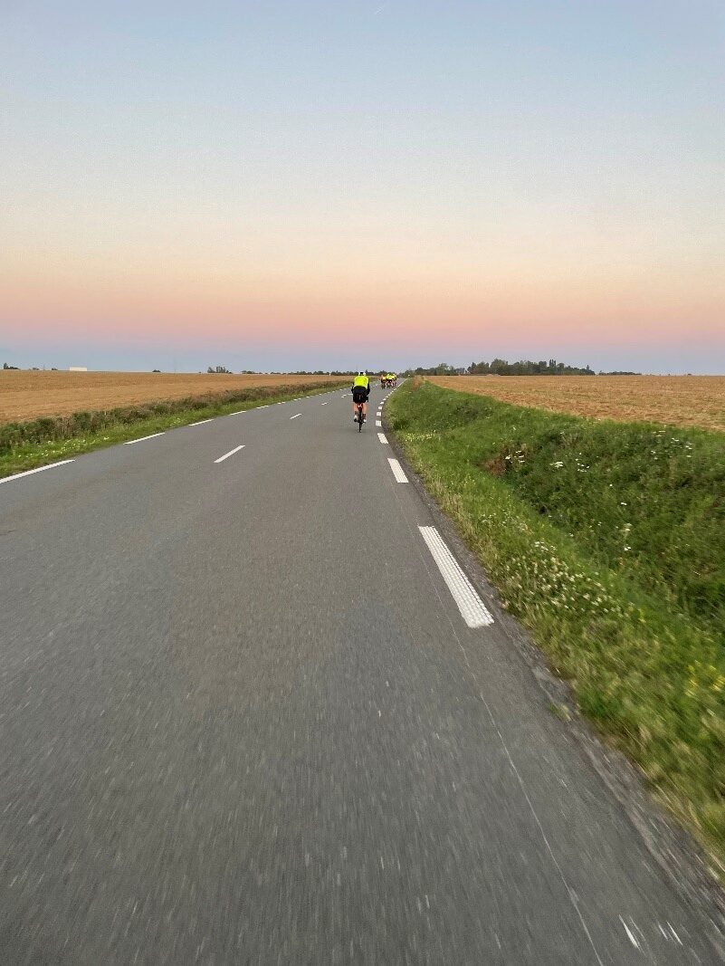 C’est une nuit magnifique pour rouler, il fait chaud, peu de vent et les routes sont belles. J’apprécie de plus en plus rouler la nuit. En revanche, nous passons souvent dans des petits villages pas toujours éclairés, à la recherche des pancartes « Paris ». Je fais remarquer à un français qu’il n’a plus d’éclairage arrière, il nous a suivi dans une longue série de descentes. Il nous raconte que sa lampe arrière est en train de charger, je lui passe ma lampe de secours. Je pensais qu’on roulerait avec lui, je ne le reverrais plus et ma lampe avec. Ce n’est pas bien grave et tant mieux s’il a pu rouler en sécurité. Nous nous arrêtons pour un café organisé par un musée du vélo, l’ambiance est conviviale mais nous ne trainons pas les pieds.