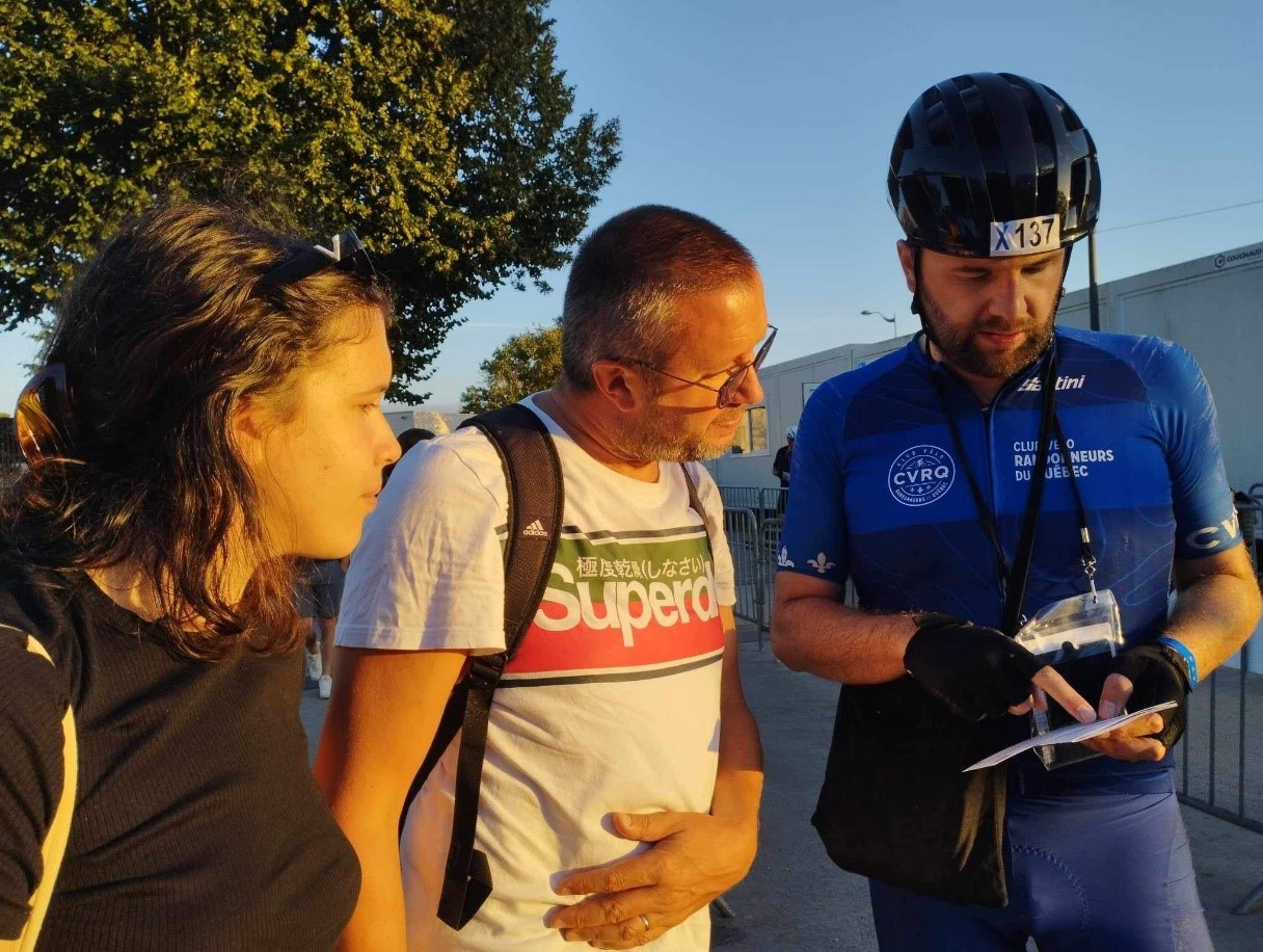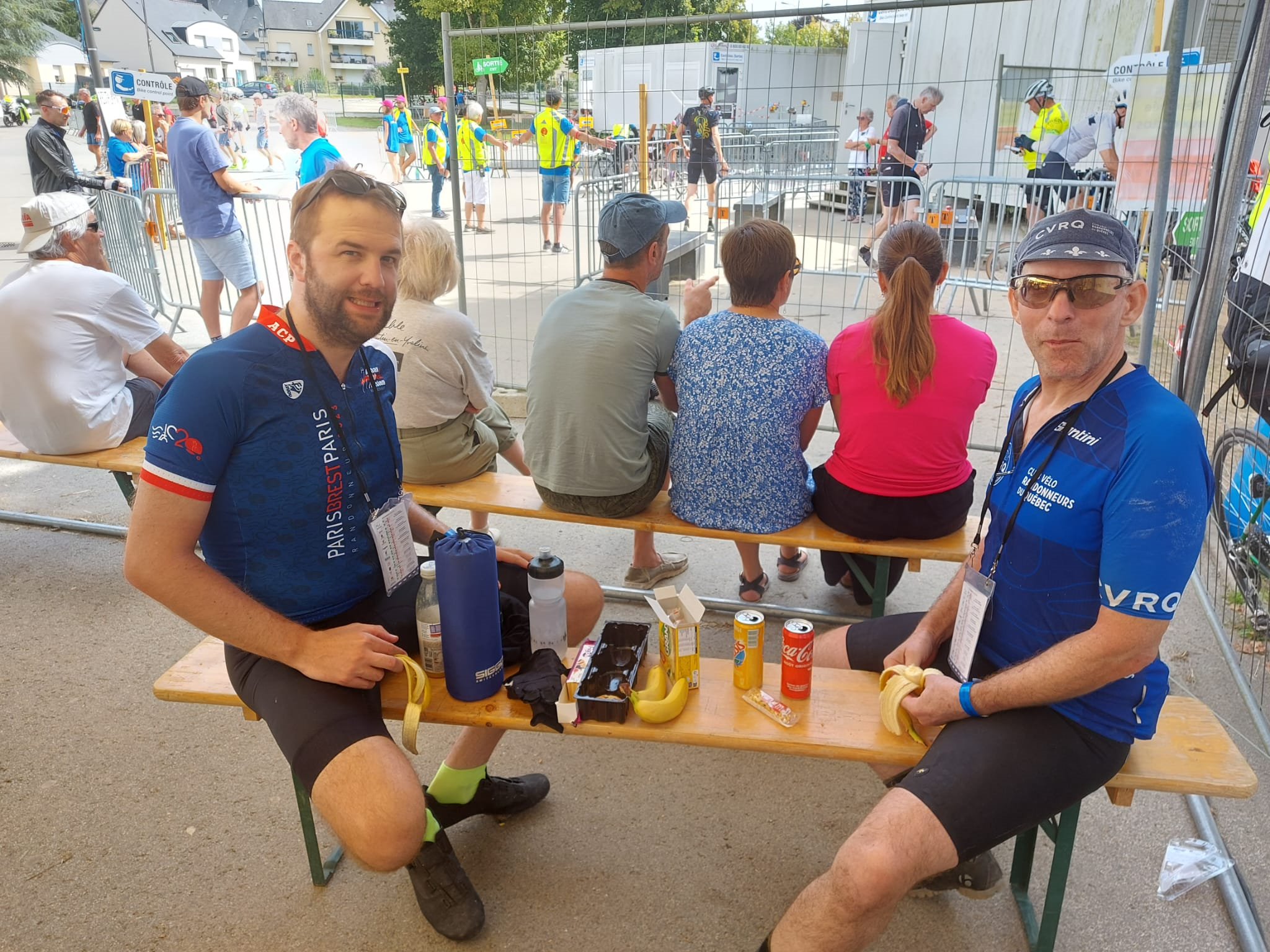 Après quelques heures de pédalage, je retrouve quelques copains du CVRQ, Marc, Martin, David et Sébastian. Nous roulerons ensemble quasiment toute la journée, sous un beau soleil. Les schtroumpfs du Québec, avec leurs tenues bleues, tirent même plus souvent qu’autrement des groupes de cyclo, mais gare à ne pas trop en mettre, la route est encore longue. A Tinténiac (354 km), je retrouve mon frère et sa famille, qui m’ont gentiment apporté plein de belles choses à manger, que je dévore rapidement. L’ambiance est superbe à Tinténiac, une vraie fête de village en ce début de soirée, le tout dans une odeur de galette saucisse.